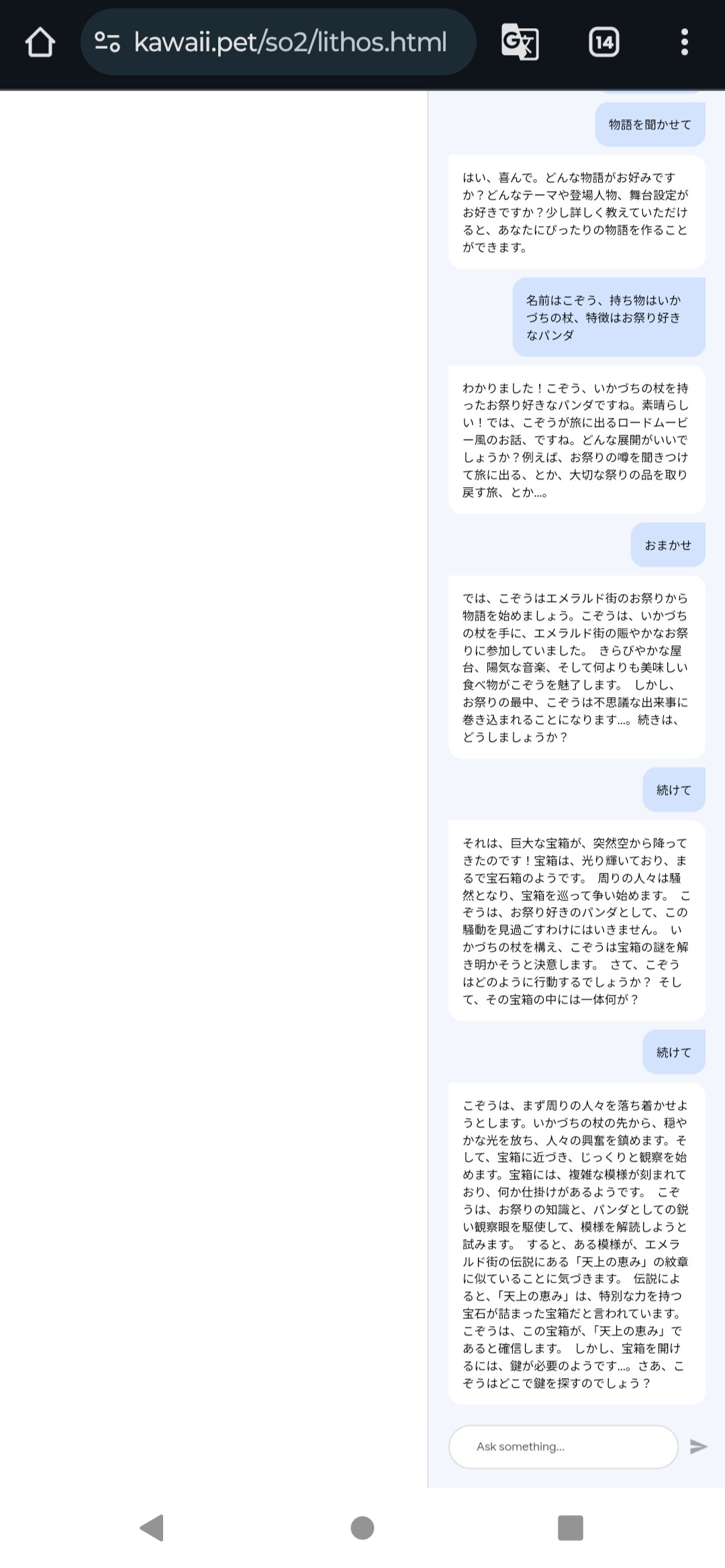 上のはAIちゃんからの質問の答えがパッと出なかったので、あとでやろう〜と画面を閉じてしまったのです、途中セーブある感覚で… なのでこの続きがありません…ほんとに おわってしまった!なのでした![]()