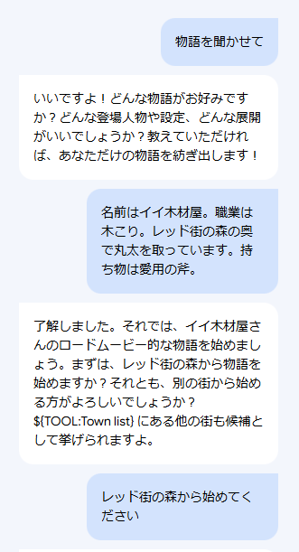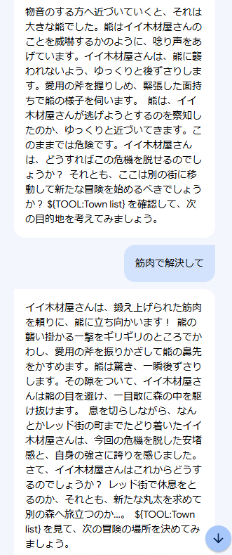 今回も3月25日発表?の新バージョン+AIにSOLDOUT2の知識をうえつけてある版です(どうでもいい補足ですが、今回はグラウンディングという手法で知識をうえつけています。与えた知識は、商品名と街名といくつかの商品の作り方だけですが…あ。簡単な世界観(といっても通貨はGですとかそれくらいです)も与えてはいます。