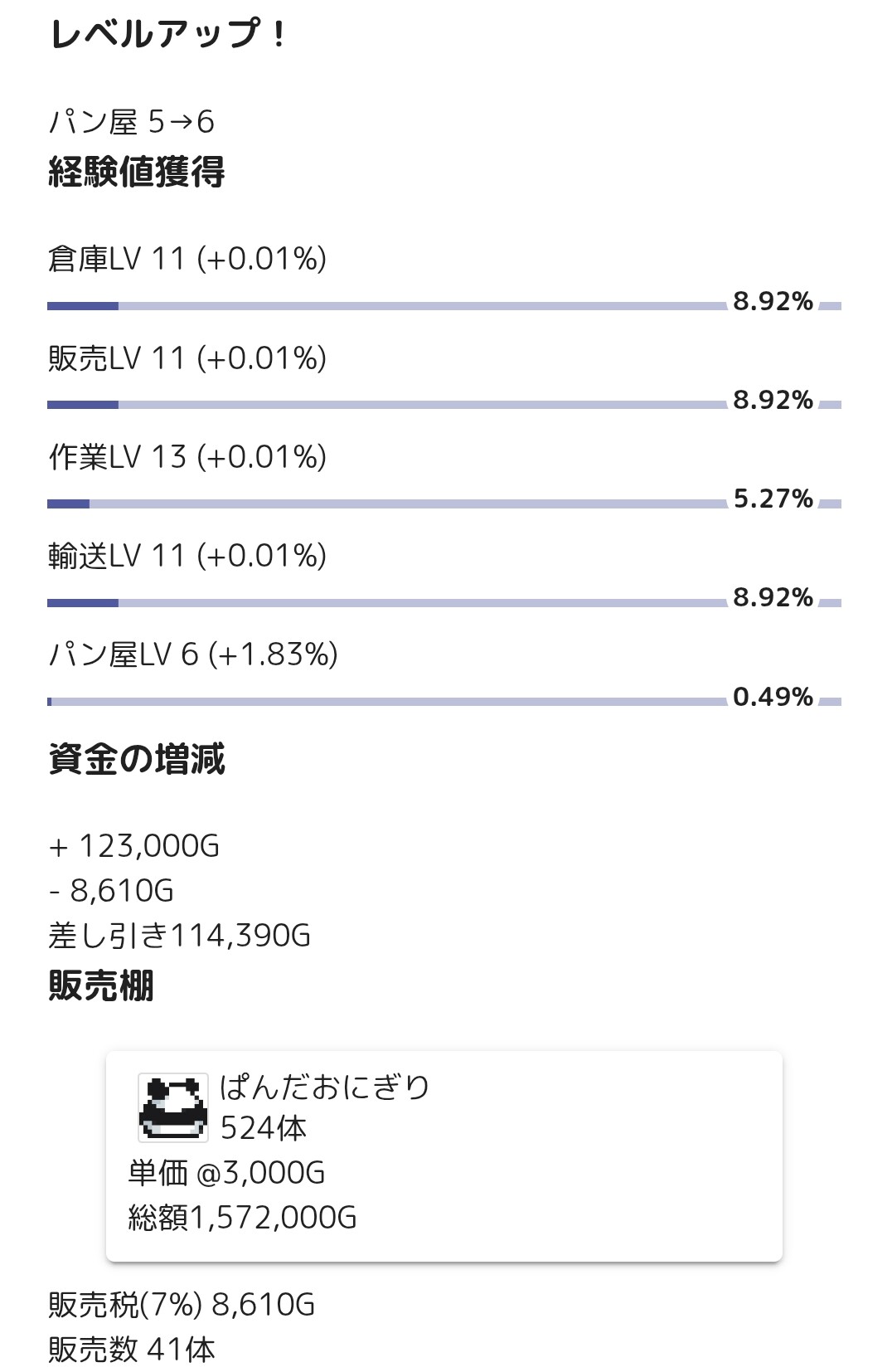 レベルアップ!そろそろ肉屋とか八百屋とかも上げに行きたい気持ち。