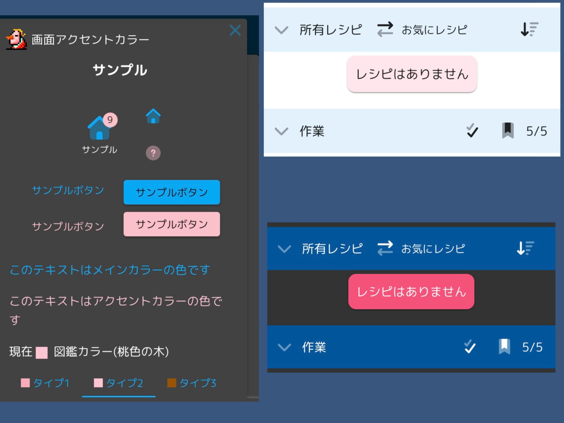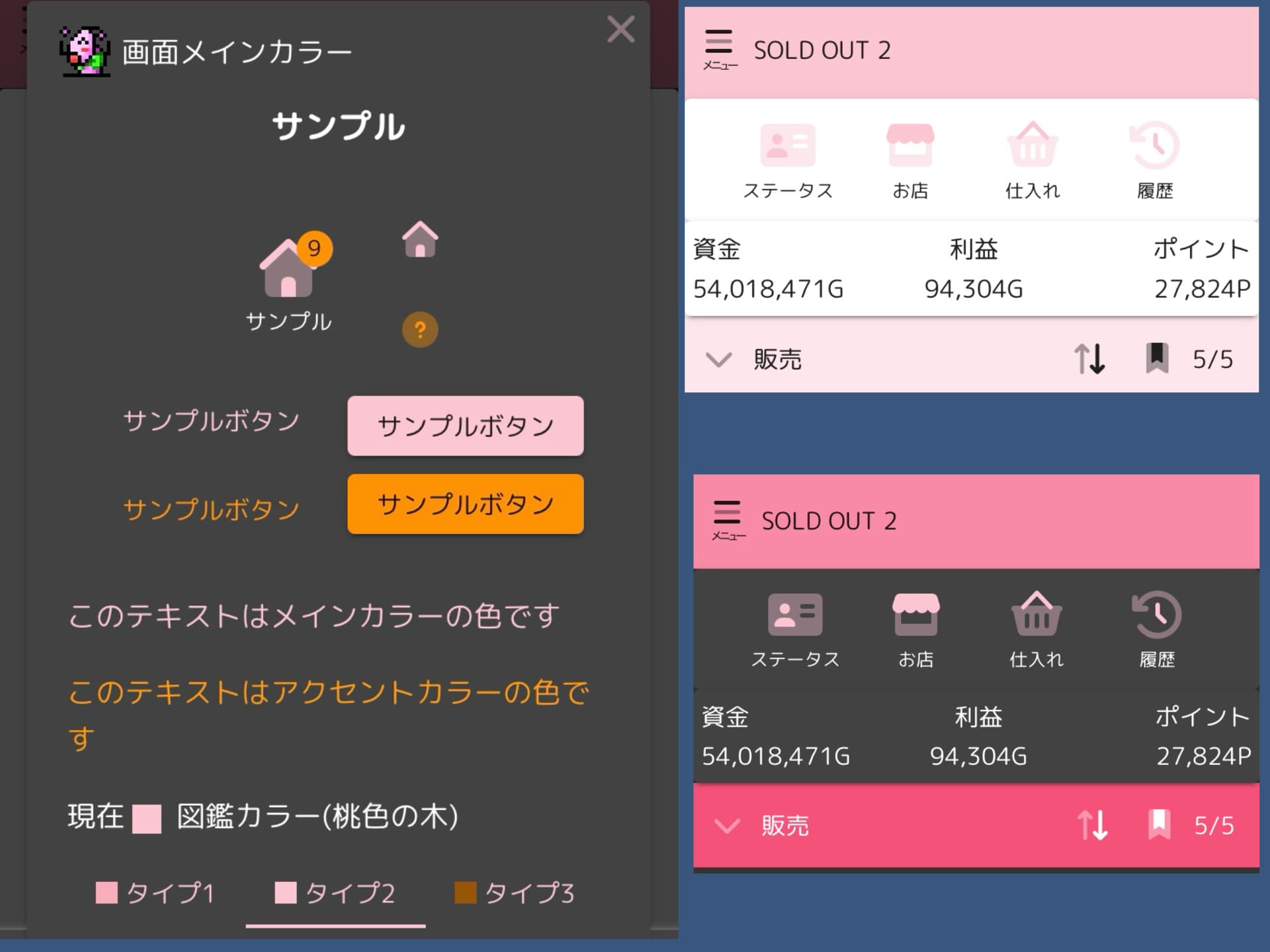 ダークモードで図鑑カラー使用時、メインカラーのメニューバーとそれ以外のバー(販売や倉庫など)、アクセントカラーの通知と「該当の商品はありません」の背景等の色調差が強いので調整していただきたいです。
