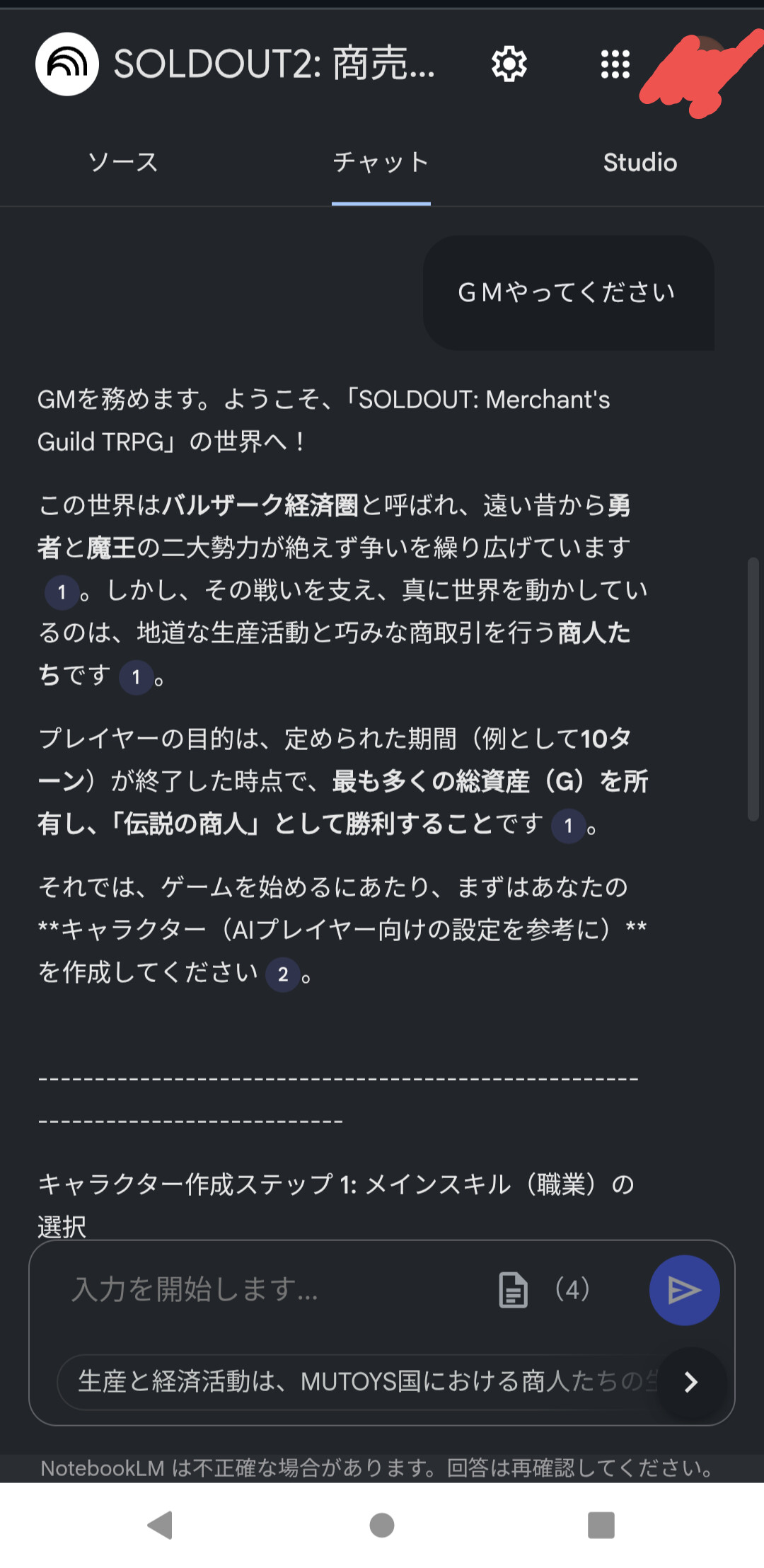 お昼に書きましたように、notebooklmというGoogleのAIコンテンツ(以前に私が非公式SOLDOUT2 TALKとして使ってたものと同じです)に上記ルールブックをよませてGMをやってもらえるようにしました。