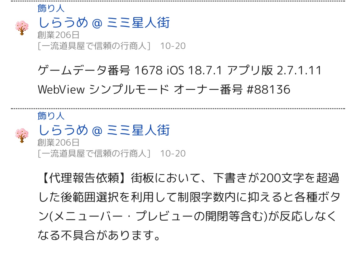 街板において、下書きが200文字を超過した後範囲選択を利用して制限字数内に抑えると各種ボタン(メニューバー・プレビューの開閉等含む)が反応しなくなる不具合があります。