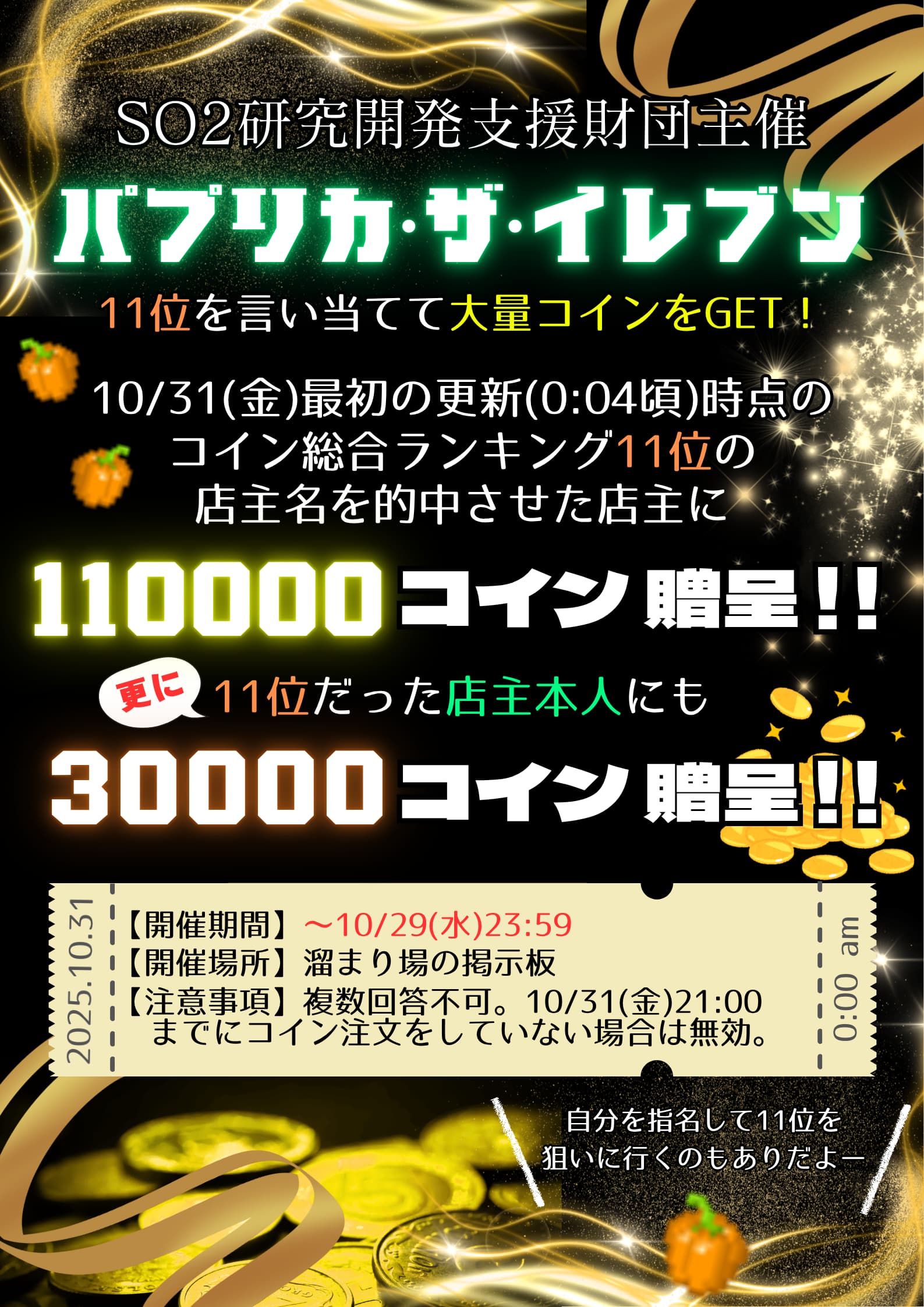 A.パプリカ祭り最終日の初更新時(10/31(金)0:04頃)のコイン総合ランキングが11位の店主名を予想し、見事的中させた方には**コイン110000枚(11s)**を財団から贈呈![]()
